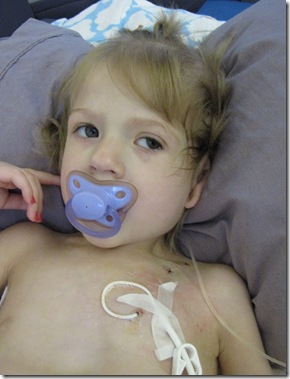 I did change her central line dressing today also. It had a lot of dried blood on it from Friday. It looks much better now. She did cry and as soon as I set up the table she just KNEW. I felt horrible but knew she would be better for me than any of the nurses…..plus no one can be more sterile than mommy!